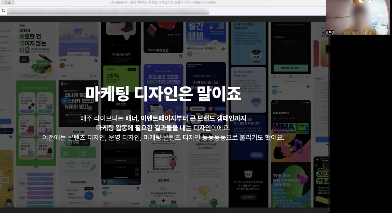 원래 목차 2번째가 <마케팅 디자이너의 업무들을 함께 보면서 어느 부분이 중요한지> 같이 보는 차례였다. 나는 이때 마케팅 디자이너의 1주일을 돌아보면서 어떤 일들을 하는지 쭈욱 읊어보려고 했다. 근데 막상 슬라이드로 쭉쭉 추가하다 보니 이 부분을 얘기하는 시간이 생각보다 많이 길어지더라?? 길어지면 가장 큰 문제가 바로 [지루해진다]는 것이다. 결국 이 부분을 대폭 줄이기로 하고, 내가 마케팅 디자인에 대해 관점을 바꾸는 계기가 되었던 업무 진행과정에 대해 얘기하는 걸로 수정했다.
