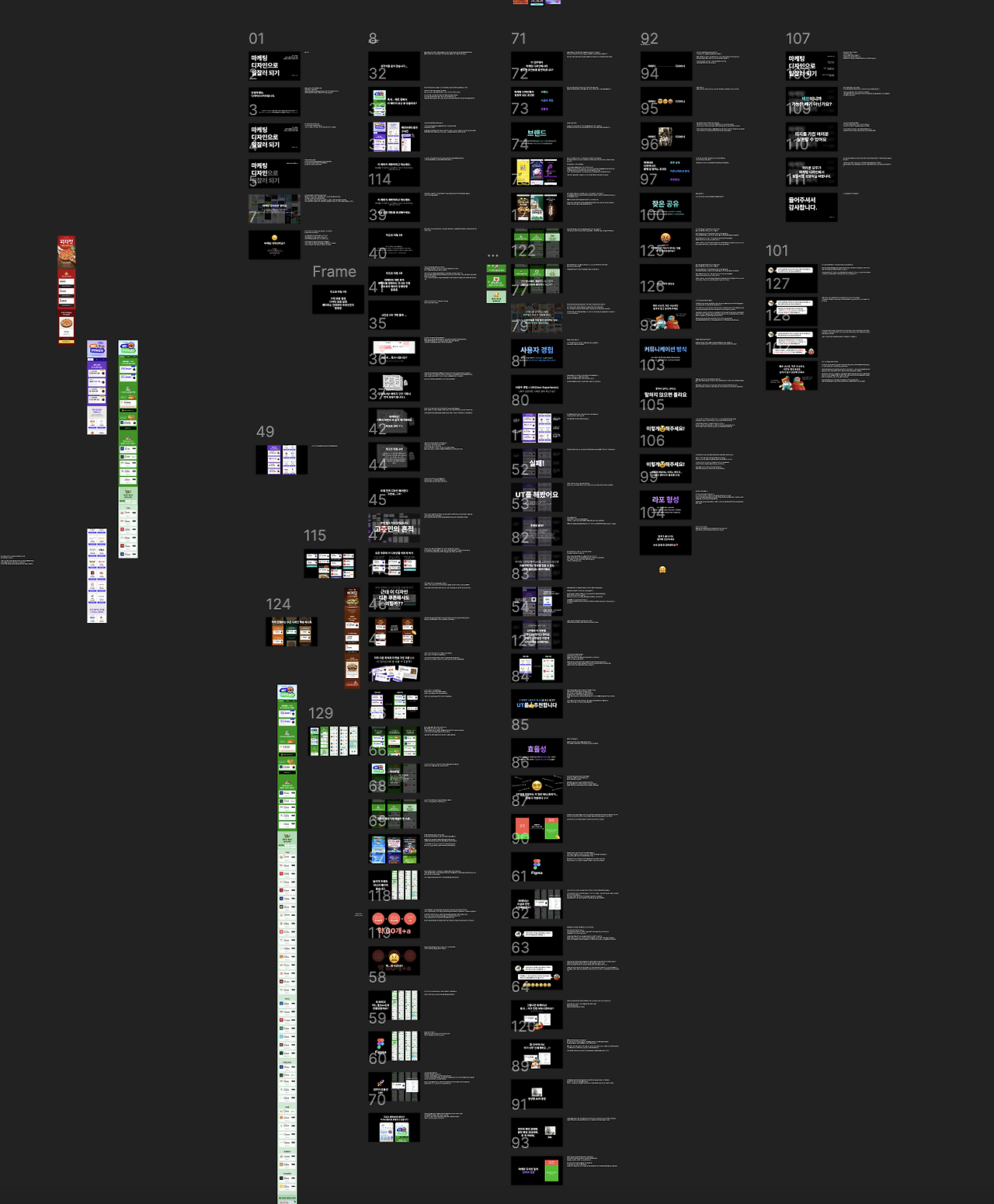 그래서 일단 최대한 내가 얘기하고자 하는 것들을 슬라이드에 모두 때려 넣기 시작했다. 디자인도 마찬가지이지만, 너무 많은 내용을 줄이는 것이 없는 내용에서 추가하는 것보다 조금 더 쉬운 편이다.(물론 사람마다 다를 수 있음) 그래서 “나중에 시간이 많이 오버되면 줄이지 뭐!”라는 마음으로 대충 슬라이드 장표를 추가하고 또 추가했다. 물론, 벌써부터 디테일을 잡진 않고 “대충 이 슬라이드에 이런 얘기 넣어야지" 하는 생각으로 와이어프레임 그리듯이 추가했다.