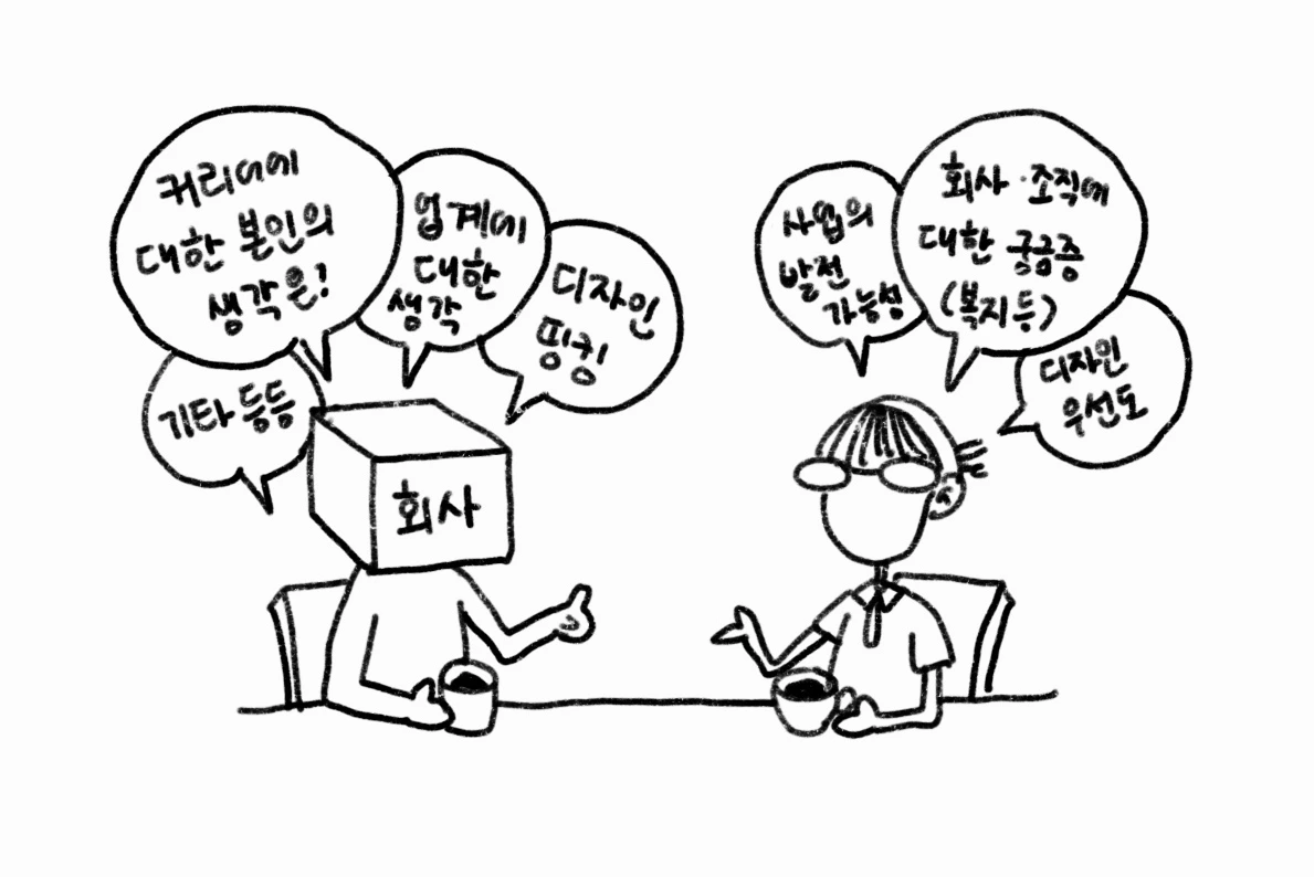 나는 커피챗이라는 대화 방식이서 참 좋은 문화라고 생각한다. 내가 회사나 사람에 대해 궁금한 것을 캐주얼하게 물어볼 수 있는 자리라니! 신청하는게 어렵지 한번 겪어보면 참 매력적인 문화다. 특히 회사에서 갇혀서 일만 하는 사람 입장에서는 회사 밖의 디자이너와 얘기할 기회가 많지 않다. 근데 그 기회의 장을 커피챗이라는 방식이 열어줬다. 물론 서로 바라는 내용이나 상황이 맞지 않아 정중히 거절하기도 했지만... 그래도 나와의 대화를 요청하는 사람들에게 감사한 입장이다.