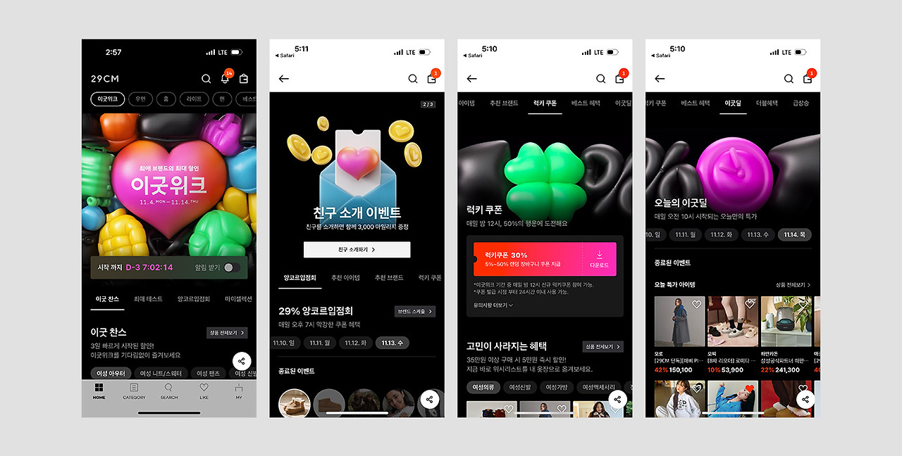 하지만 정말 중요한 대형 프로모션이나 캠페인은 그럴 수 없다. 여기서 말하는 대형 프로모션이나 캠페인은 29cm 기준으로는 이굿위크(상반기, 하반기에 진행하는 1년 중 제일 큰 행사), 이굿홈위크 등의 대형 할인행사인데, 여기서 이벤트페이지 및 광고영역에는 [이 서비스에서 지금 행사 엄청 크게 한대!]라는 메시지를 담는다. 중요한 것은 바로 [이 서비스]라는 것을 알리는 데에도 한 몪 한다는 것이다. 예를 들어 내가 자주 쓰는 패션플랫폼 지그재그, 29cm, Wcomcept(더블유컨셉)에서 동시에 블랙프라이데이를 진행한다고 가정해 보자. 이 3개의 비주얼이 다 비슷비슷하다면 대체 어떤 서비스에서 할인을 진행하는지 그 서비스가 머리에 남지 않는다. 그렇기에 이런 캠페인이나 대형 행사에서는 우리 브랜드를 잘 보여줄 수 있는 키비주얼이나 전반적인 콘셉트를 잘 잡는 것도 중요하다.