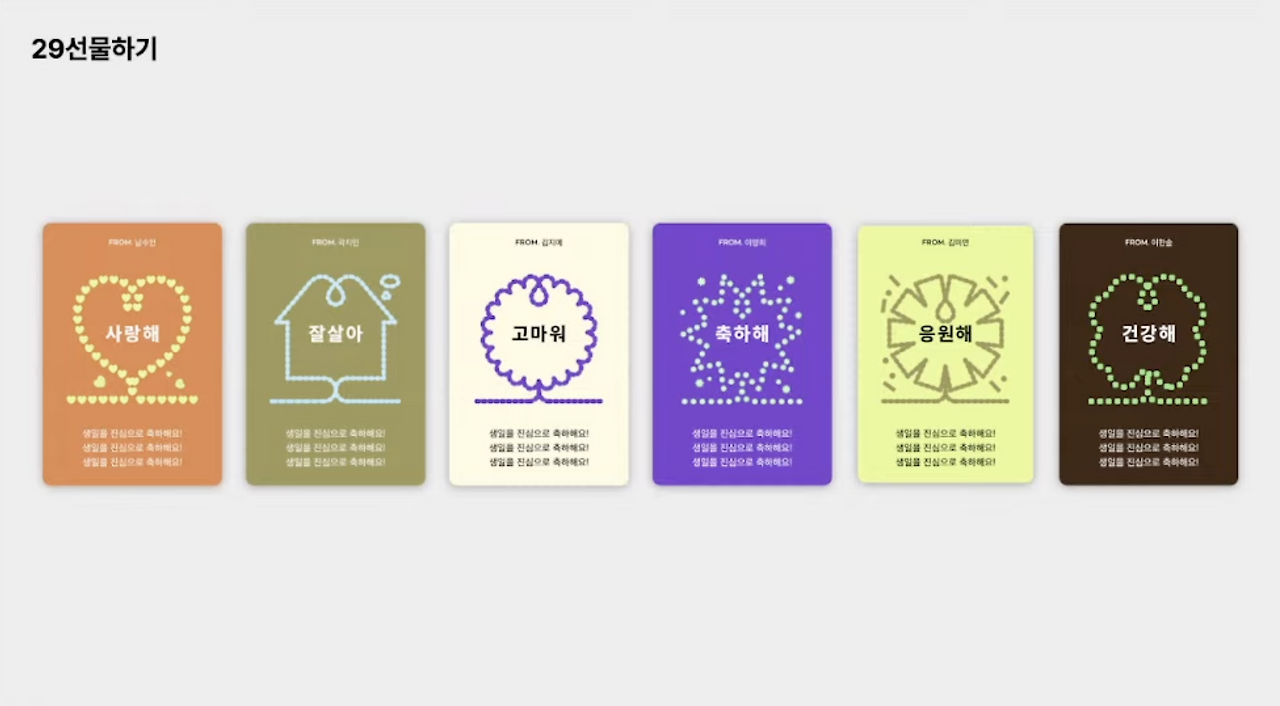예를 들면, 29선물하기 심볼같은 경우 리본의 형태에서 모티브를 따온 디자인인데, 보통 선물하기 서비스에서 흔히들 쓰이는 선물상자 이미지를 쓰지 않는 부분에서 차별점을 주었다. 그렇게 도출해 낸 것이 선물상자 위의 리본 형태였다. 곡선을 따라서 우아하게 묶이는 리본. 그렇게 29선물하기 로고 및 키비주얼이 탄생했다. 이런 아이디어 도출 및 제작 과정이 포트폴리오에 잘 담겨야 내가 가진 BX디자인 역량을 보여줄 수 있을 것이다.