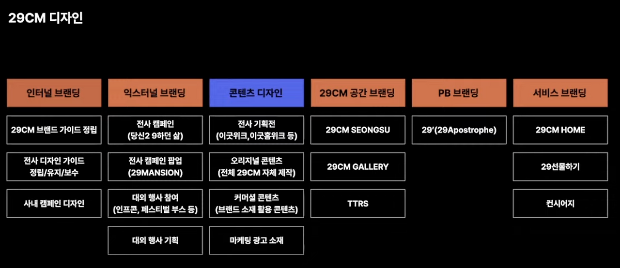 일단 조직도를 설명하는 부분에서, 지금 세미나에서는 29cm의 마케팅 디자인 이야기는 없겠구나 했다. 마케팅 디자인과 BX 디자인은 내가 봤을 때에 29cm에서는 어느 정도 구분이 되어있는 상태인데, 그렇다면 조직이 분리되어 있어야 할 것이다. 사실 조직도가 정말 궁금하긴 했다. 왜냐하면 이전 마케팅 디자인 관련글(마케팅 디자인 조직을 만든다면)에서도 언급했지만, 회사마다 이 일을 어떻게 생각하냐에 따라 프로덕트에 가까울 수도 있고 브랜딩에 가까울 수도 있기 때문이다.
