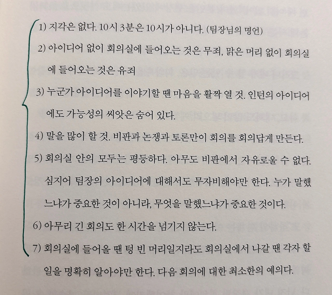 작년에 제주도의 만춘서점에서 기쁜 마음으로 구매한 책이 있다. 김민철 작가님의 [우리 회의나 할까?]라는 책이다. 가장 치열한 곳에서 가장 신박한 아이디어를 요구하는 광고판에서는 회의를 어떻게 진행하는지 보여주는 책인데, 나는 이 책에서 회의를 기록하는 화자의 입장보다는 회의에 들어오는 [팀장님과 시니어들]의 역할에 집중했다. 다들 회의에 아이디어를 들고 왔는데 그 어떤 것도 만족스럽지 못할 때, 그리고 카피라이터들이 수많은 아이디어들을 툭툭 던질 때 이를 주도하는 사람은 어떻게 행동할까? 프로젝트 회의를 주관하는 일이 많아진 요즘, 이 책에서처럼 회의가 위대한 순간이 되게끔 하고 싶은데 어떻게 해야 할지 모를 때 가끔 열어보는 책이다.