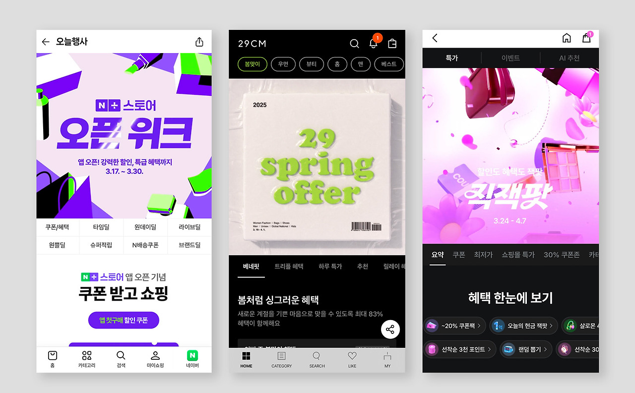 최근 들어 이 스크롤을 최소화하려는 움직임이 조금씩 보인다. 상단의 키비주얼 영역 높이값을 줄여서 아래의 내용이 ATF(Above the fold, 사용자가 앱에 진입했을 때 스크롤 없이 바로 보이는 화면) 영역 내에 보이게끔 한다. 또는 아래 내용을 슬쩍 보여주면서 “이 아래에 이벤트 정보가 있어요!”라는 뉘앙스를 풍긴다. 가끔 특별한 캠페인 페이지 같은 경우 아래 스크롤을 내리라는 인터랙션을 추가할 때도 있다.