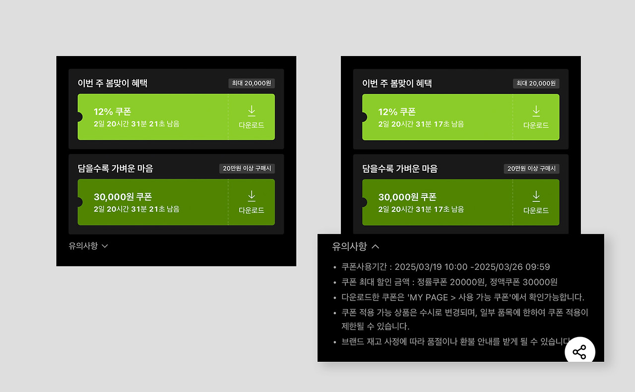가령 쿠폰을 예로 들면, 쿠폰에서 제일 중요한 것은 [얼마나 할인해 주는 쿠폰인지] [어떤 혜택이 있는 쿠폰인지]다. 이 부분은 정말 쿠폰에서 최우선 정보라서 이 부분은 필수로 쿠폰에 노출시켜야 한다. 이다음으로 중요한 것은 [쿠폰 받는 액션]이다. 버튼을 받게 하든지, 이미 지급을 완료한 상태인지를 표시해야 한다. 그럼 이 외의 정보들은 어떻게 하냐면, 이 페이지에서 [숨긴다]. 버튼을 눌렀을 때 해당 영역이 표시되는 접고 펼치기(folding) 방식을 사용하거나 팝업을 사용한다. 중요도가 낮은 정보들은 “확인하고 싶은 사용자들은 이 버튼을 누르면 확인할 수 있어요”라고 유도하는 것이다.