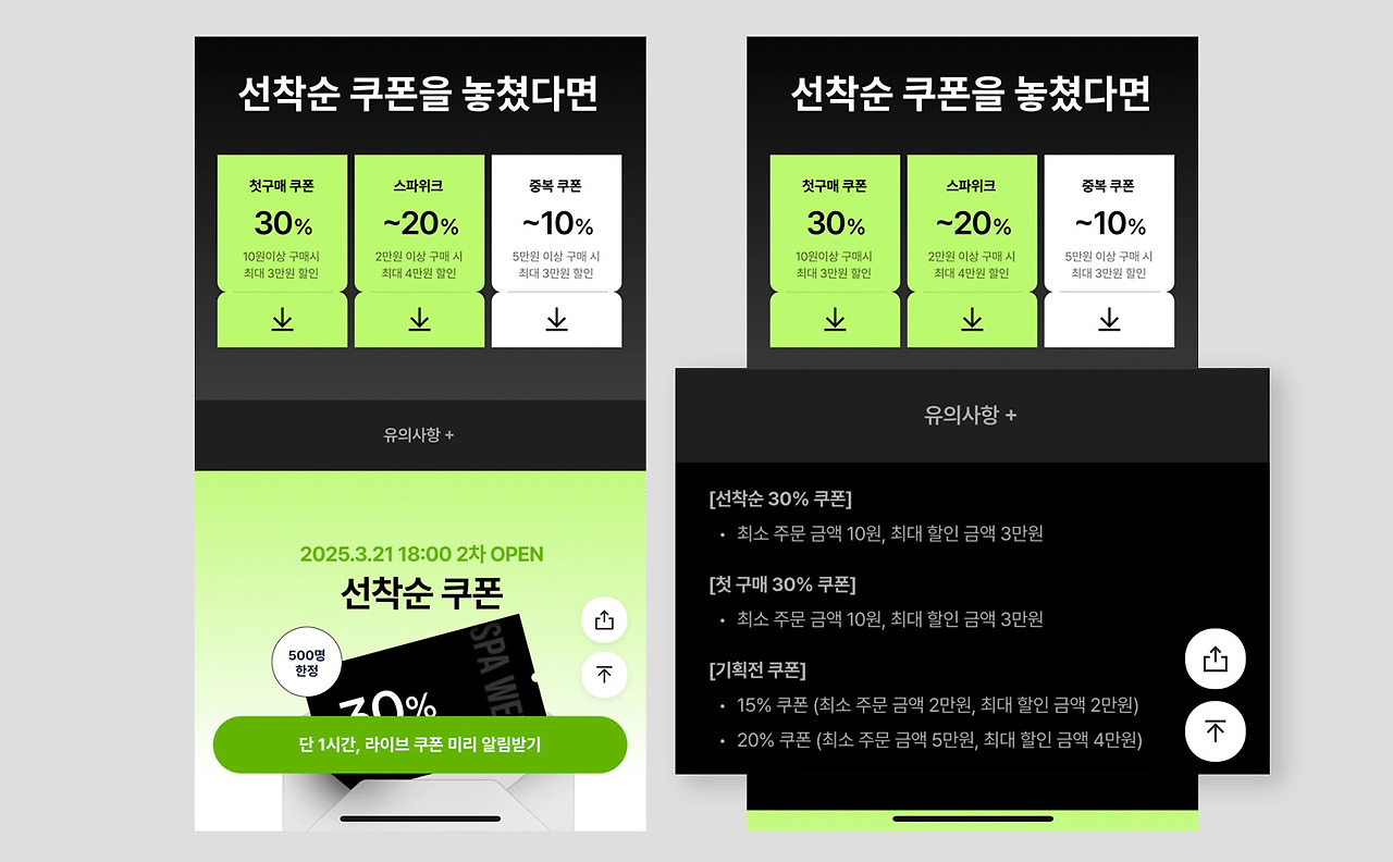 만약 마케터와 디자이너가 서로의 의견을 좁히지 못하는 상황에서 이 글을 디자이너들이 본다면 내가 디자인 작업할 때 넣어야 하는 정보를 어떻게 정리하는지, 다른 사람들이 내 디자인에서 정보를 알 수 없다고 하는지를 생각해 봤으면 좋겠다. 내가 만든 쿠폰을 보고 쿠폰 받는데 무리가 없는지 주변 사람들에게 물어보는 것도 좋다. 그리고 만약에 이 글을 마케터나 기획자가 본다면… 모바일 환경에서 보여줄 수 있는 정보는 제한되어 있는 것을 알았으면 좋겠다. 적당한 정보는 보여줄 수 있으나, 너무 많은 정보는 모두 보여주기 어렵다. 특히나 페이지의 스크롤을 줄이고 싶은 니즈가 크다면 더더욱 이 부분을 기억했으면 좋겠다.