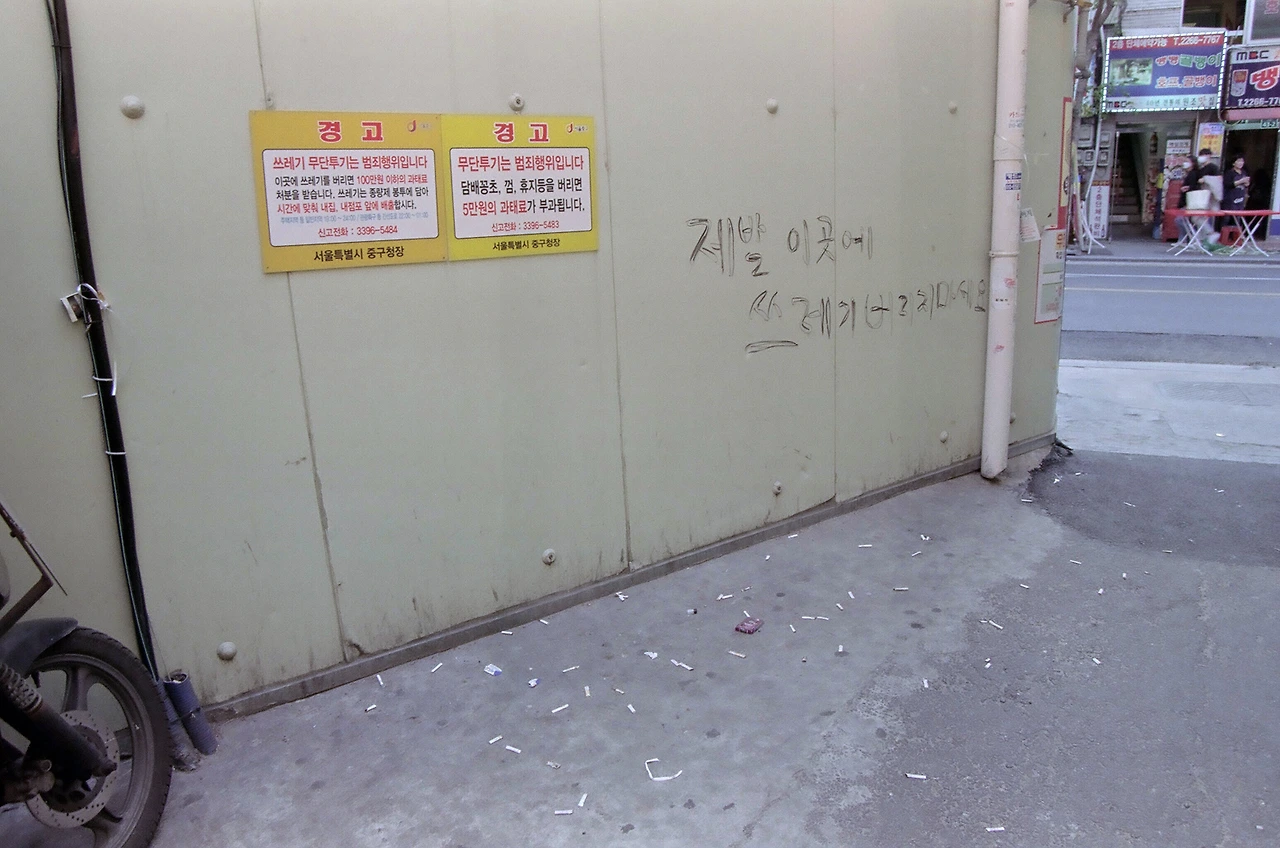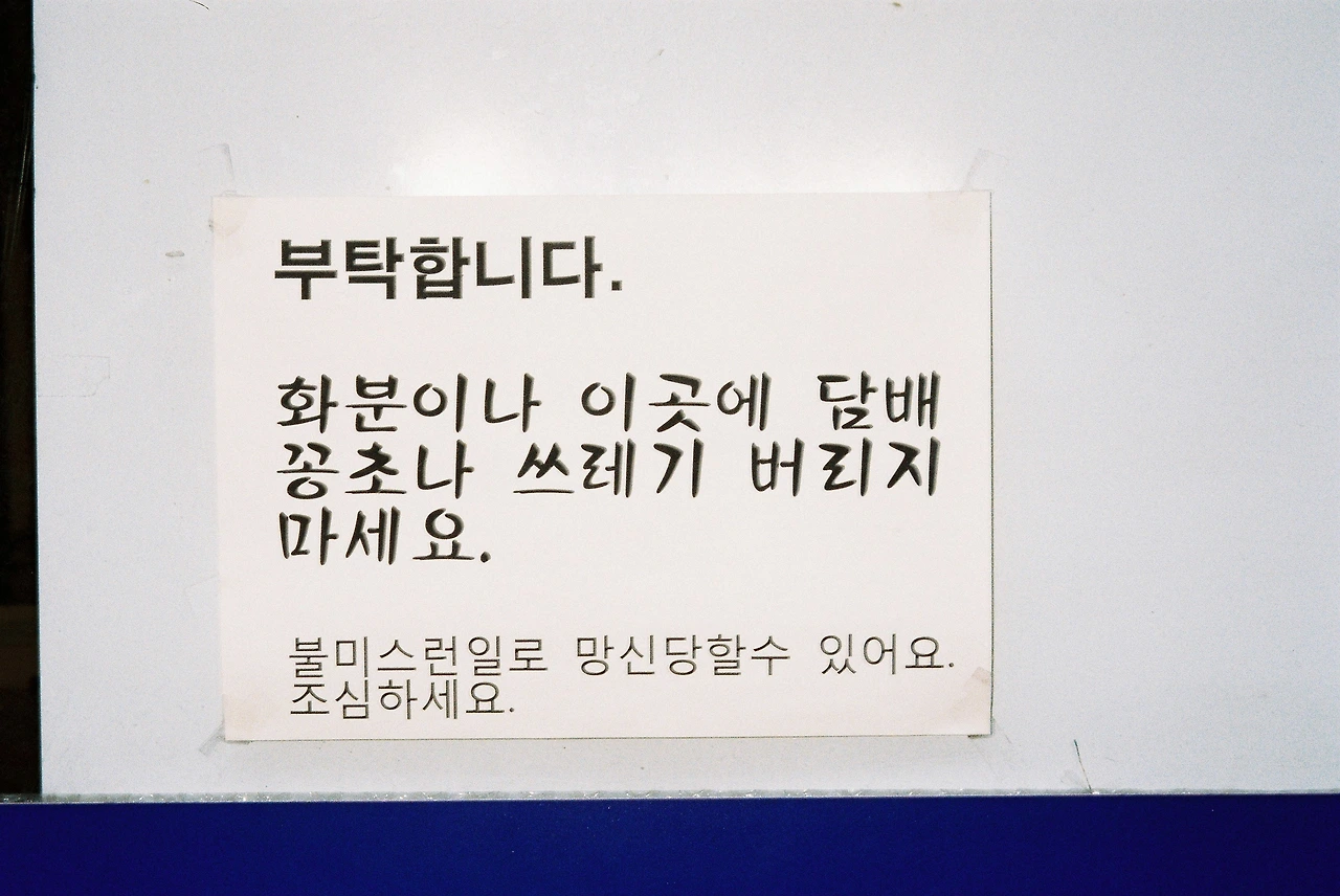 새로 산 필름 카메라를 들고 테스트를 해볼 겸 빠르게 을지로를 한 바퀴 돌면서 사진을 찍어보았다. 일상에서 쉽게 접할 수 없는 을지로의 날것 그대로의 모습은 언제나 매력적으로 다가온다. 그런데 뭔가 자꾸 불편했다. 좋은 것들만 담고 싶었는데 카메라 뷰파인더로 좋지 않아 보이는 것들이 너무 많이 보였다. 을지로는 대로보다 골목골목에 재미있는 것들이 많은데 어느 순간 쓰레기와 담배꽁초 천지가 되었다. 금연 표시와 쓰레기를 버리지 말라는 경고. 심지어 부탁을 하는 문구도 보았다. 하지만 이를 무시하는 듯 바닥에는 역시나 쓰레기와 꽁초가 가득했다. 좋은 것만 찍어보려 했던 나는 이 순간 완전히 마음이 바뀌었다. 우리의 양심에 대해서 찍어보기로.