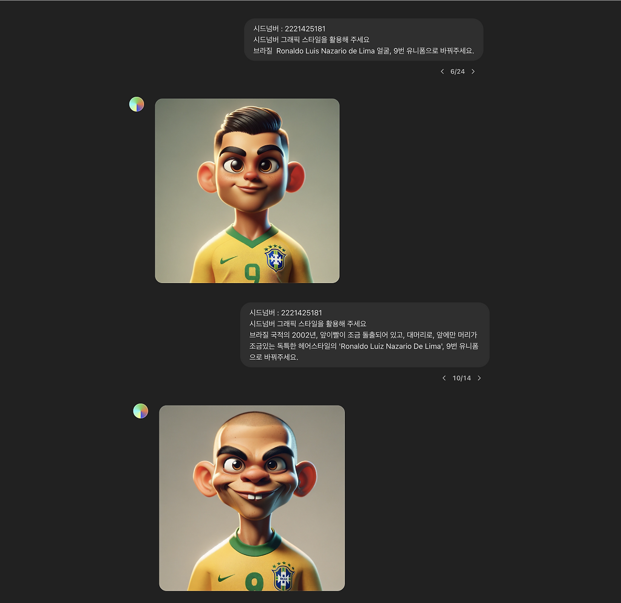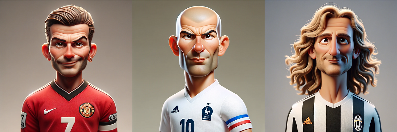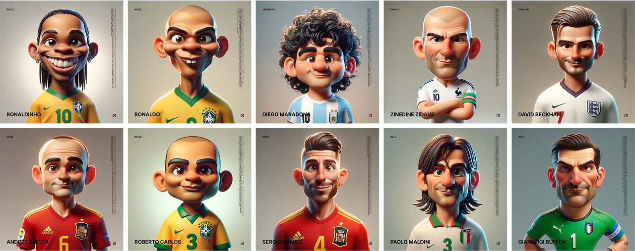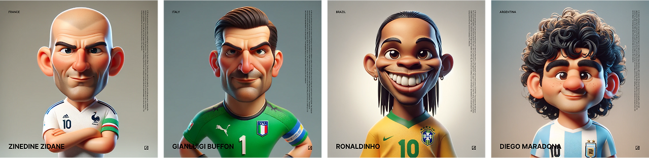 생성된 이미지 중에서 적당히 귀여우면서도 디테일이 살아있는 스타일이 마음에 들었고, 이 스타일을 유지하면서 내가 생각하는 위대한 축구 선수들을 만들어보기로 했습니다. 아래처럼 외형적 개성이 뚜렷한 선수들은 비교적 빠르게 잘 생성되었습니다.