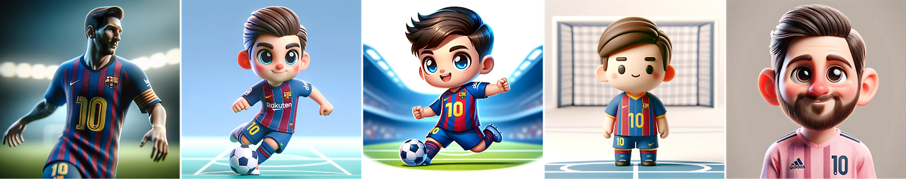 제가 최고로 좋아하는 선수인 메시는 여러 가지 버전으로 따로 만들어 봤습니다. "바르셀로나 유니폼", "아르헨티나 유니폼", "발롱도르 트로피와 메시" 등의 프롬프트를 입력해 다양한 모습으로 생성했습니다.