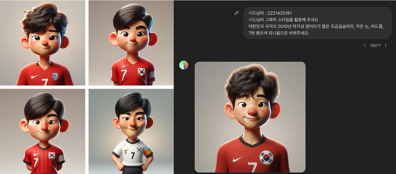 몇 번의 프롬프트 수정이 필요했고, 외형 특징과 유니폼 번호, 국적 등을 프롬프트에 입력해 원하는 결과를 얻은 선수들 이미지입니다.
