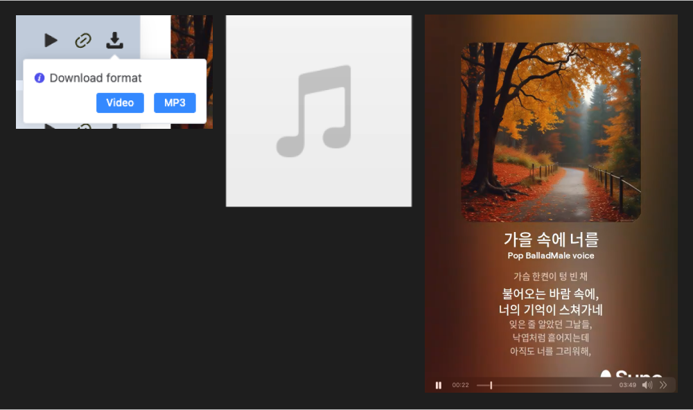 Udio 에서 생성한 음악은 MP3와 Video(MP4)로 추출할 수 있으며, Video버전은 간단한 이미지 썸네일과 함께 가사가 흘러가는 영상을 제공합니다.
