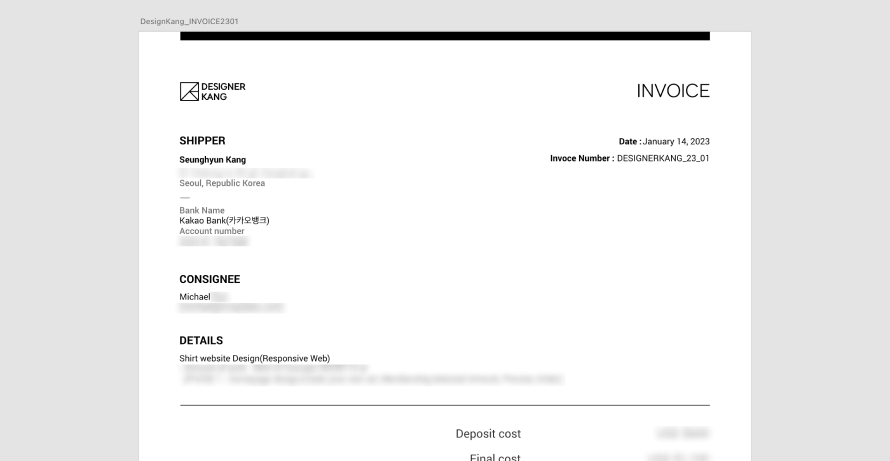 규모가 조금 더 큰 프로젝트는 계약서를 작성하고, 단계별(시작40%, 완료60%)로 입금이 진행되는 형태로 협상하거나, 업체에서 인보이스를 요청하는 경우도 있었습니다. 그때는 급하게 인보이스 디자인을 뚝딱 만들어서 사용했습니다. ㅎ