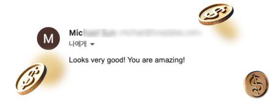 여담으로.. 처음 입금 받을때 클라이언트 구글메일 프로필 사진이 갱스터 같은 프로필을 하고있어서 불안함반, 신기함반의 감정으로 은행 계좌를 새벽에 계속 리로드 하며 확인했던 것 같습니다~