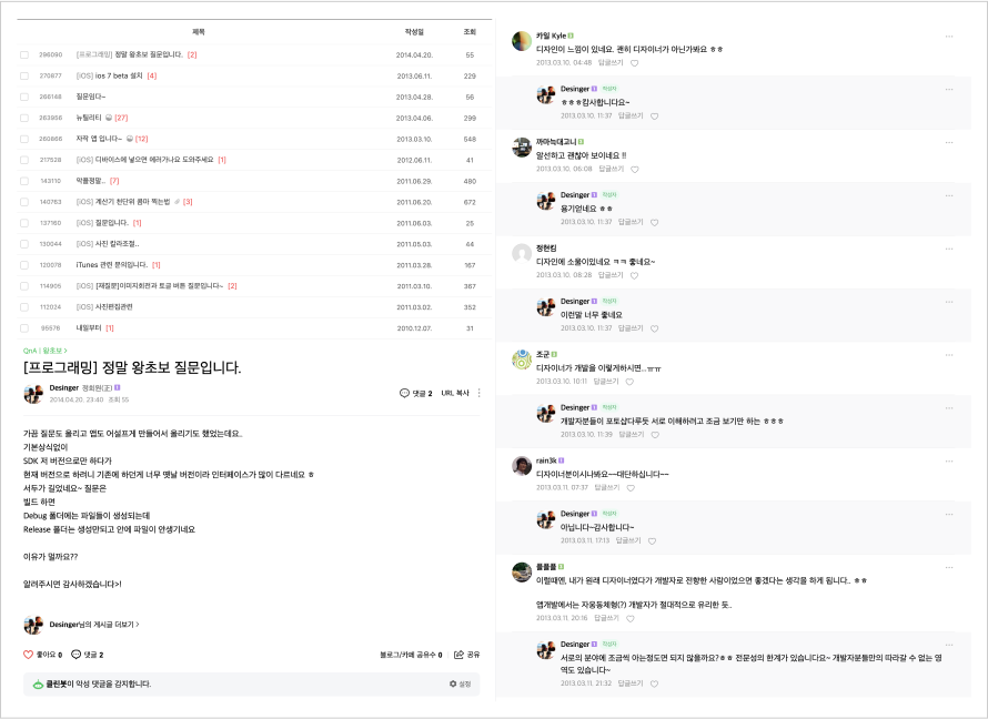 이렇게 개발자 커뮤니티에 글을 올리기 시작하면서 얻은 별명이 바로 ‘개자이너(개발+디자이너)’였습니다. 개발자분들이 신기해했던 것 같아요. 기능적인 부분보다는 심미적인 부분에서요.