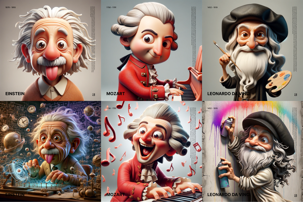 이번 프로젝트에서는 제가 존경하는 역사적 인물들을 AI 기술로 재해석하여 새로운 캐릭터로 만들어 보았습니다. 아인슈타인, 모차르트, 레오나르도 다빈치, 그리고 스티브 잡스까지 각 분야에서 위대한 업적을 남긴 인물들을 3D 그래픽과 귀여운 스타일로 표현해 본 경험을 공유합니다.