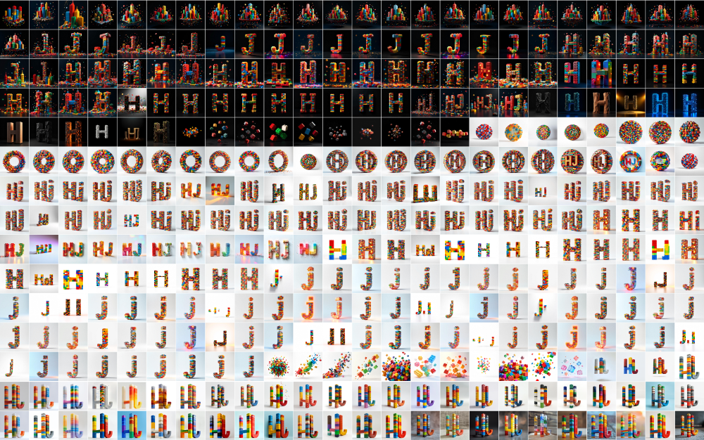 AI가 많은 것을 도와주지만 이 모든 과정이 그냥 한 번에 땅땅 되는 것은 아니었고요, 원하는 컬러 조합과 블록의 각도, 이미지의 디테일을 위해 여러 번 시도해야 했습니다. 이미지가 랜덤 하게 생성되기 때문에, 마치 사진 촬영에서 수백 장의 사진을 찍고 A컷을 찾는 과정과 비슷하다고 느꼈습니다.ㅎ