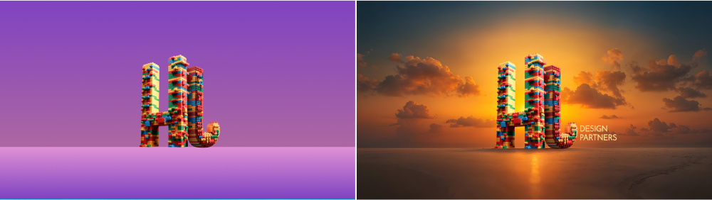 시안 제작을 위해서 AI 툴을 적극적으로 활용하였는데 레고 브릭 재질로 건축사무소의 건물 디자인이나 로고 형태를 유지하는 데에 조금 제약이 있었습니다. 예를 들어, Firefly는 ‘레고’라는 키워드를 포함한 프롬프트를 거부했기 때문에 원하는 재질의 이미지가 바로 생성되지는 않았습니다. 작은 컬러 브릭 같은 키워드를 넣어보기도 했지만, 유사한 블록 형태는 만들어지지만 원하는 디자인과는 결과가 달랐습니다.