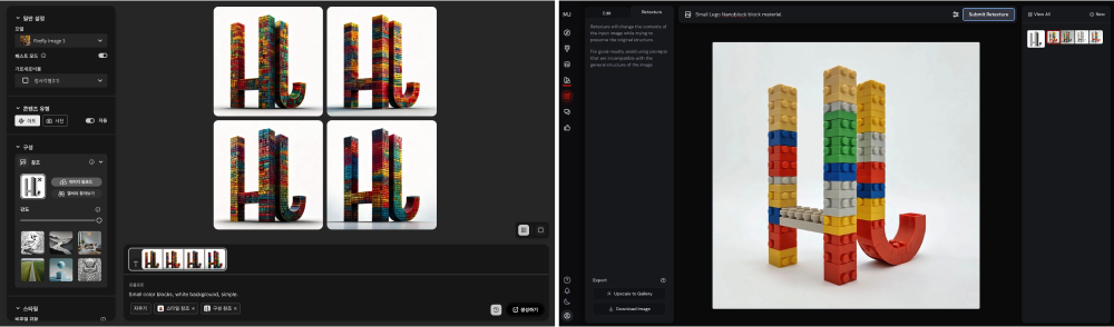 이런 한계를 해결하기 위해 혼합 방식을 사용했습니다. 먼저 Firefly에서 레고 블록 재질의 형태를 대략적으로 생성한 후, FluxAI(FreepikAI)에서는 레고 재질을 적용한 건물이나 알파벳을 생성했습니다. 이렇게 생성된 두 가지 요소를 포토샵에서 간단히 합성하여 필요한 이미지로 완성했습니다. 마지막으로 FreepikAI의 스케일업 기능을 사용하여 디테일을 보정했는데, 이 기능이 이미지를 자동으로 매끄럽게 다듬어 주는 점이 특히 유용했습니다.