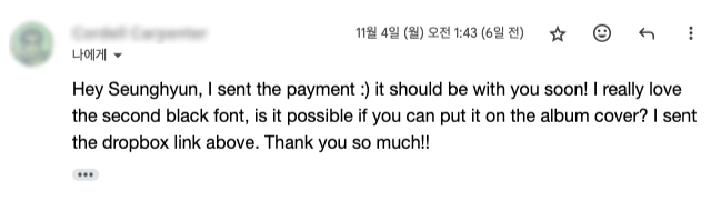 그렇게 앨범 디자인을 간단히 마무리했어요. 간단한 작업이었지만, 외국 분들은 호응이 좋더라고요! 이런 메일들은 항상 큰 힘이 됩니다.