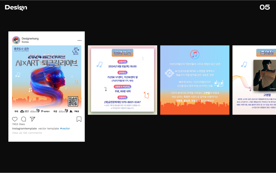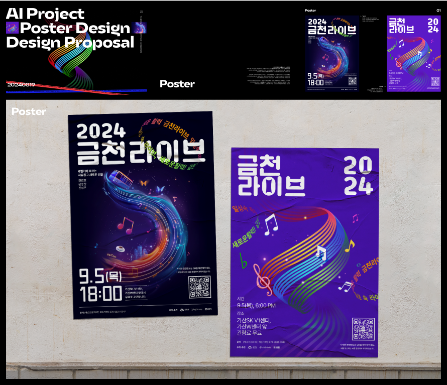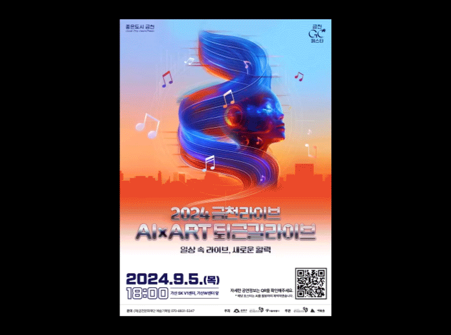 이번 작업은 AI를 활용해 포스터와 공연 음악을 제작하는 데 큰 매력을 느껴 시작하게 되었습니다. 다소 애를 먹기도 했지만, 금천문화재단의 빠른 협업 덕분에 잘 진행될 수 있었습니다.