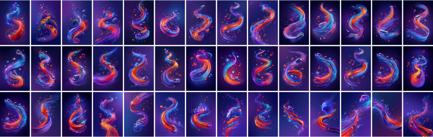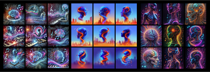 ‘AI스럽다’는 것이 사람마다 다르게 느껴질 수 있어서, AI 비주얼을 어떻게 표현할지 고민이 되었습니다. 그래서 AI의 도움을 받아보았습니다. 특정 키워드 없이 ‘Music, AI’라는 프롬프트를 넣었을 때, 여러 가지 이미지들이 생성되었고, 이를 참고해 AI 비주얼의 전형적인 모습을 파악할 수 있었습니다.
