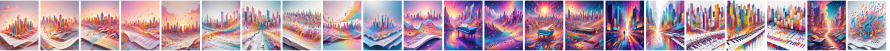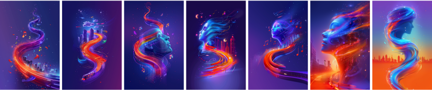 컨셉에 맞는 이미지 제작을 위해 Dall-E를 활용해 다채로운 컬러, 오선지, 음표, 버스, 건물 등의 사연이 포함된 프롬프트를 입력하여 이미지를 생성했습니다.