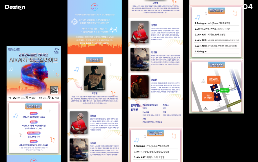 최초 시안을 금천문화재단에 전달했을 때, 재단쪽에서 ‘더 AI스럽고, 사연 모집 포스터처럼 밝은 느낌이 좋겠다’는 의견을 주셨습니다. 사실 저는 저녁 시간대의 공연이라 어두운 배경이 더 어울릴 것 같았고, AI보다는 공연 내용에 초점을 맞추는 게 맞다고 생각했었습니다.