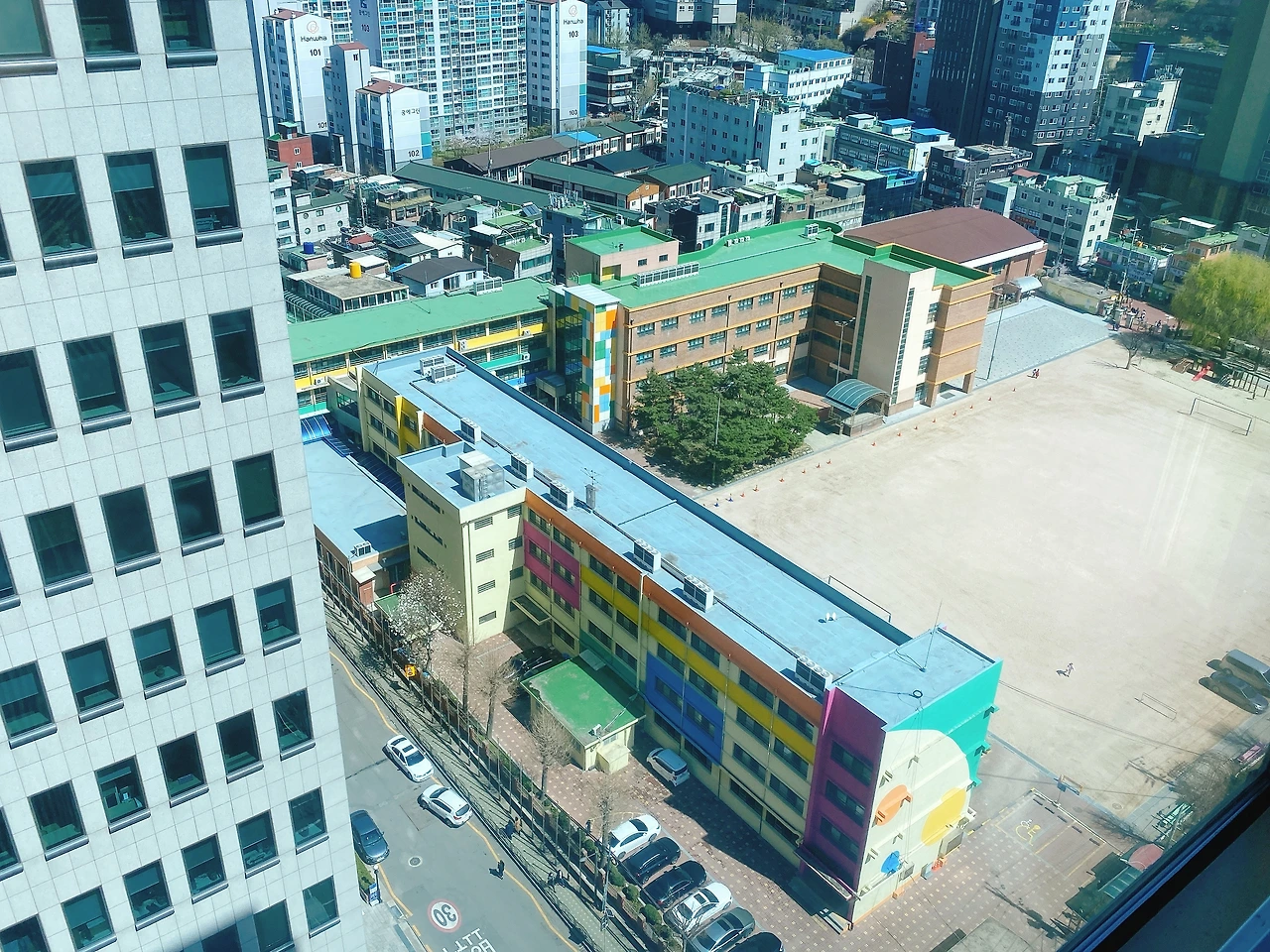 초고층 빌딩 숲 사이엔 뜬금없이 100년 가까이 된 알록달록한 초등학교가 있다. 그 주위론 오래된 상가들이 즐비해있다.