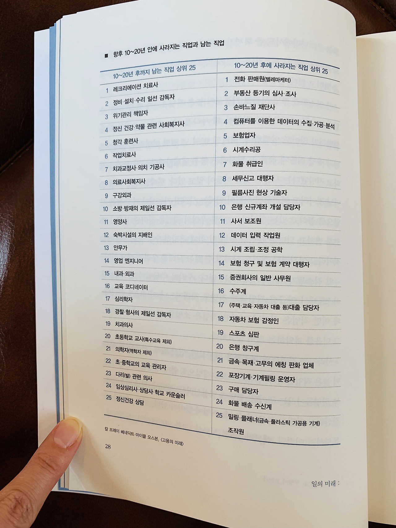 2013년 옥스퍼드 대학의 칼 프레이 베네딕트와 마이클 오스본 교수 팀이 < 고용의 미래 The future of employment >라는 보고서를 발표했다. 이 보고서에 있는 ‘향후 10~20년 안에 사라지는 직업과 남는 직업’ 리스트에 따르면 지금 있는 직업의 47%가 사라질 가능성이 크다.