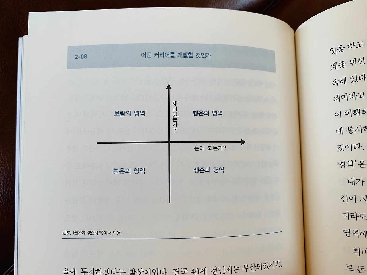 그렇다면 '나만의 일'을 어떻게 찾아야 할까. 어떤 것이 '나만의 일'일까. 이런 판단에 도움이 되는 기준이 있다. (중략) '재미있는가'와 '돈이 되는가'라는 기준이다. 이 두 기준으로 보면 사분면이 생긴다. 재미도 있으면서 돈이 되는 일을 하고 있으면 '행운의 영역'이다. 돈은 되지만 재미는 없으면 생계를 위한 '생존의 영역'이다. 지금 많은 직장인이 이 생존의 영역에 속해 있다. '보람의 영역'은 돈은 별로 안 되지만 재미가 있는 일이다. 재미라고 말해서 가볍게 느껴지지만, 만족감이나 사명감 등으로 바꾸어 이해하면 된다.