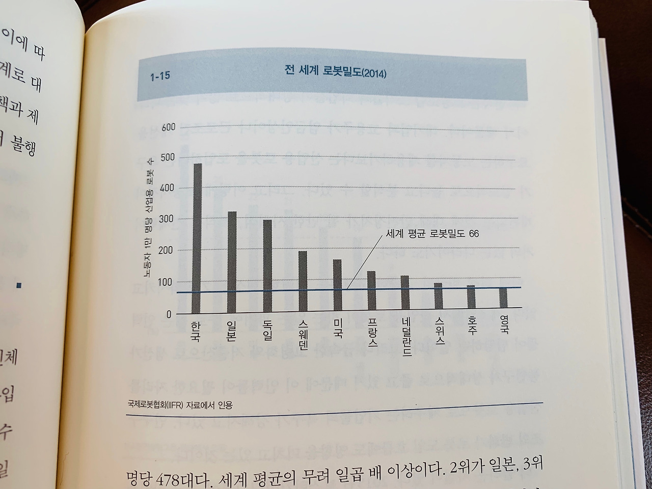 물론 아직까지는 로봇이 인간의 정신적 능력은 말할 것도 없고, 신체적 능력조차 완벽하게 대체하기 힘든 경우가 많다. (중략) 그러나 인간의 일을 대신하기 위해 인간이 하는 모든 판단과 동작을 복합적이고 연쇄적으로 수행할 필요는 없다. 인간이 수행하는 노동 과정을 부분으로 나눠 그 일을 기계가 반복적으로 대신하게 하면 되기 때문이다. 그렇게 볼 때 이미 한국은 로봇이 인간의 노동력을 대체하는 속도가 가장 빠른 나라이고 가장 비중이 높은 나라이다.