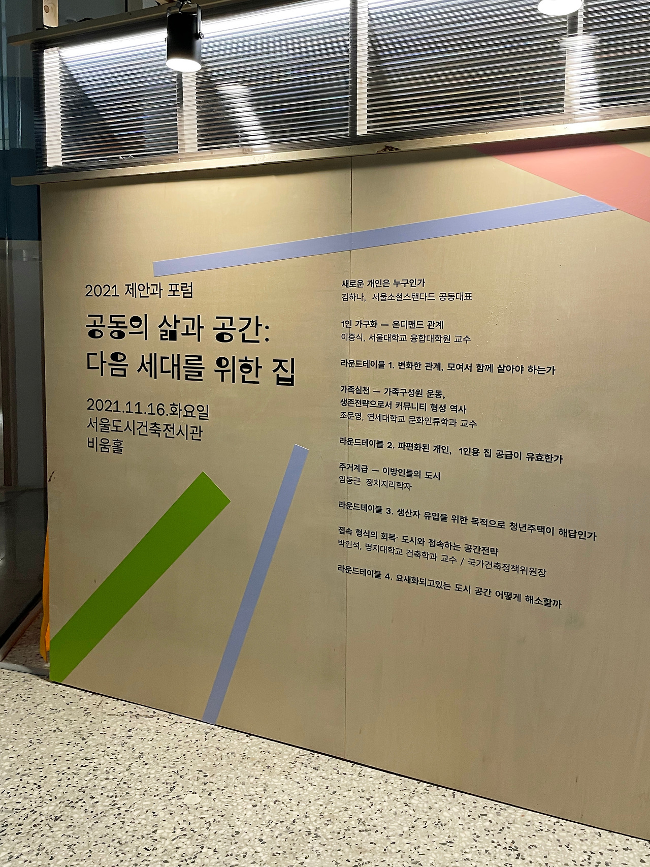 1인 가구 수가 급격히 증가하면서 집은 가족과 함께 사는 공간이라는 인식이 바뀌고 있다. 공유 주거, 1인 주택, 청년 주택 등 혼자 사는 삶에 대한 각종 대안이 쏟아져 나오는 이 시점에 다음 세대를 위한(다음 세대는 젋은 세대, 미래의 노인이 될 모든 세대 포함) 미래 주거 형태를 상상해보는 전시가 열리고 있다고 하여 다녀왔다.