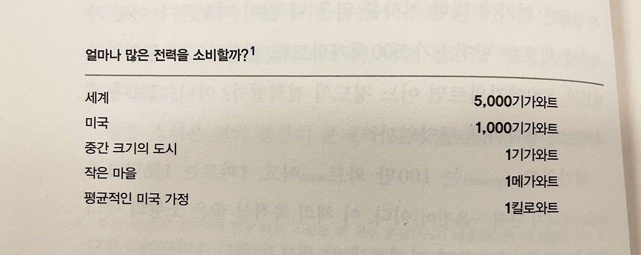 - '킬로와트'라는 말을 들으면 '가정'을 떠올리면 된다. 기가와트는 '도시', 그리고 수백 기가와트나 그 이상은 '나라'라고 생각하면 된다.