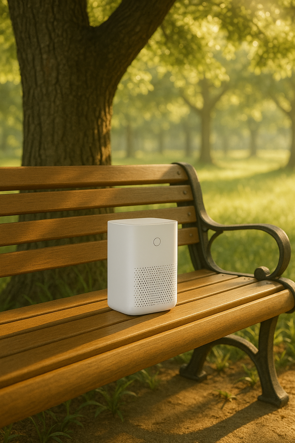 예시) 아침 햇살이 비치는 나무 아래 벤치 위에 있는 미니멀한 디자인의 미니 사이즈 공기청정기, 리얼 포토 광고 이미지