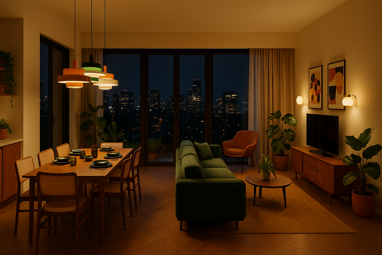 평면도에 표시된 빨간색 화살표 시점에서 수평 3D 렌더링을 생성해 달라는 문장 뒤에 공간 범위(ex. 오픈 플랜의 주방-거실 공간)와 구체적인 배치를 설명하면 됩니다.