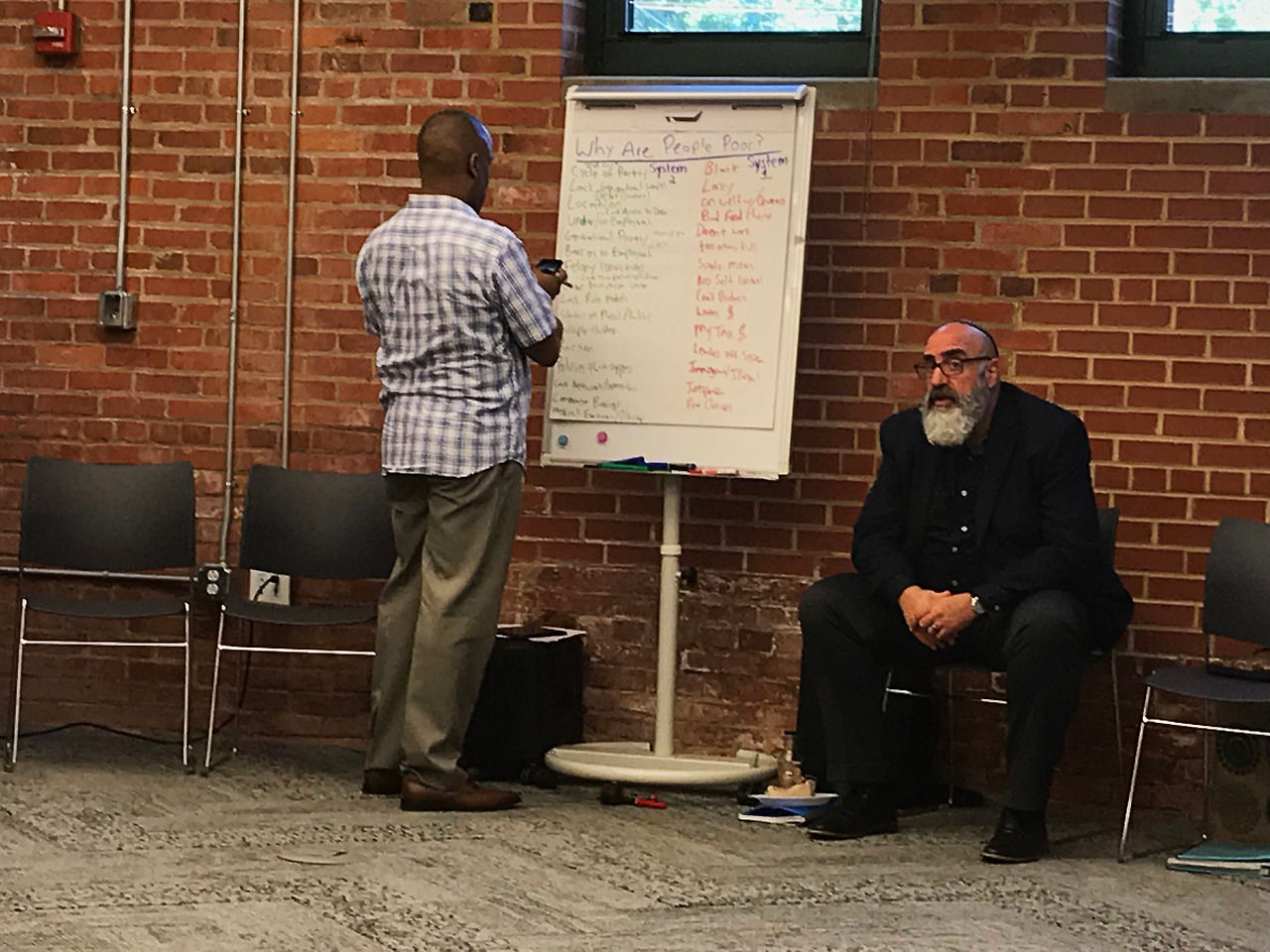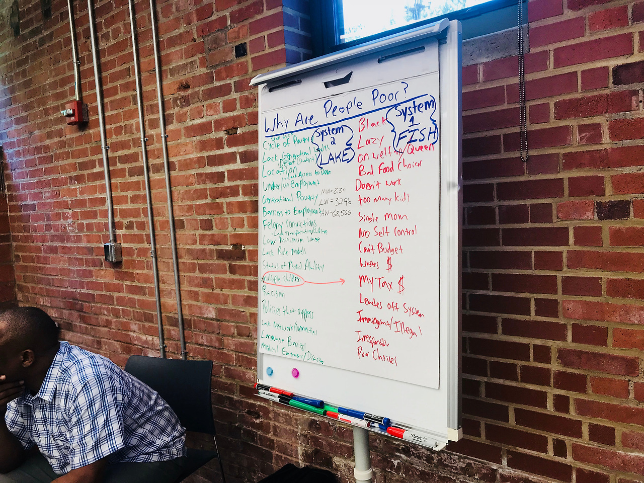 몇 개의 질문이 이어진 후, '가난한 사람은 왜 가난한가?'라는 질문을 던졌고, 참석한 사람들의 대답을 들으며 보드에 쓰기 시작했다. 그의 다음 질문은 '금요일 저녁 5시 한 여성이 세 명의 아이들을 데리고 마트에서 계산하려고 서 있는데, 지갑을 찾지 못해 우왕좌왕하고 있는 그녀 뒤로 줄이 점점 길어지기 시작하면서 사람들이 웅성거리기 시작했다고 가정했을 때, 이 여성에 대해 떠오르는 것은 무엇인가?'였다.