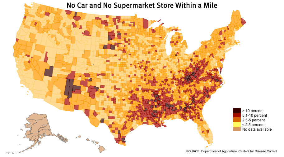 차도 없고, 슈퍼마켓도 없는 푸드 사막에 거주하는 사람들이 무려 1,100만 명. 이는 주로 사회 빈곤층이 밀집되어 있는 지역과 일치하는데, 그중에서 70% 정도가 아프리카계 흑인이라고 한다.