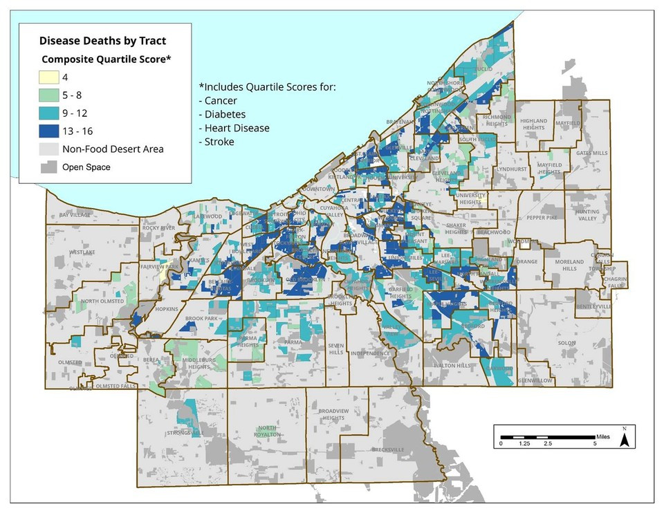 클리블랜드에 안에서는 약 450,000명의 사람들이 푸드 사막에 거주 중이며, 137,000명 이상의 사람들이 슈퍼마켓에서 2마일(약 3.2km) 이상 떨어진 곳에 살고 있다.