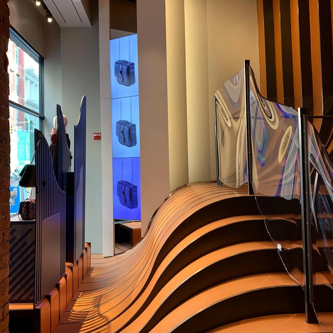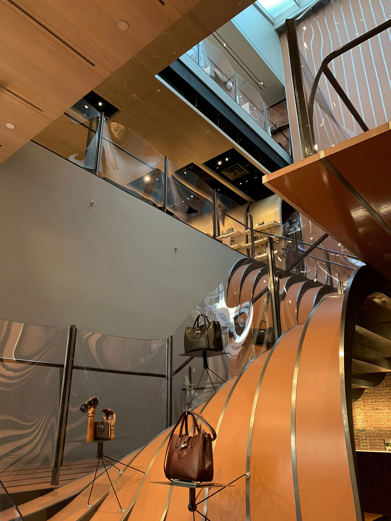 토마스 헤더윅(Thomas Heatherwick)이 디자인했다는 소호의 롱샴(Longchamp) 매장. 물결이 치는 듯한 곡선의 매끄러움이 상당히 인상적이다.