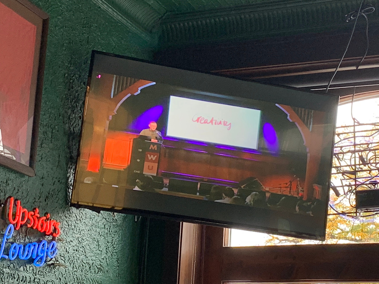 클리블랜드에서 밤에 출발해서 6시간을 달려오고 2시간밖에 자지 못한 데다가, 하루 종일 콘퍼런스 장에 앉아있으려니 슬슬 갑갑함이 밀려왔다. 그런데 옆에 앉아 있던 미국 아저씨 말이 펍에서도 콘퍼런스를 들을 수 있다는 것이다! 마침 다음 강의는 The Future Is Kid Stuff. 잘 됐다 싶어 바로 옆에 있는 펍으로 자리를 옮겼다.
