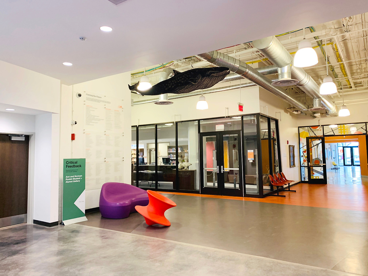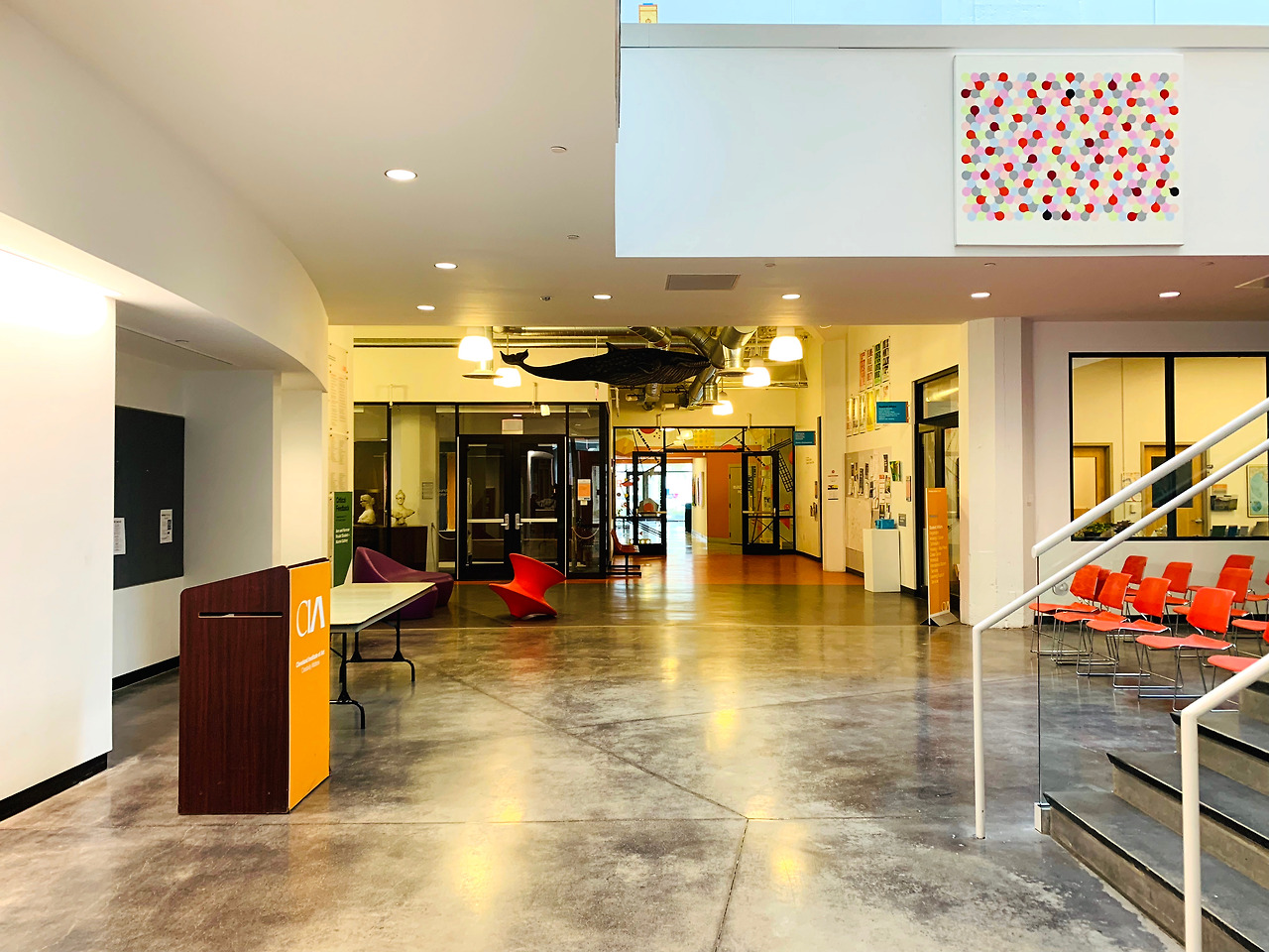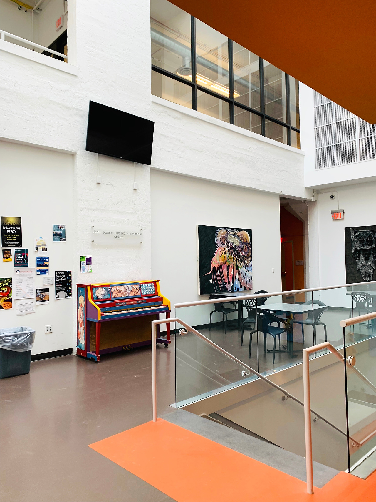 무채색의 공간에 오렌지로 포인트를 활용했다. 켄트 대학 건축과 건물과 비슷한 느낌이지만, 예술 & 디자인 학교답게 곳곳에 다양한 학생들의 작품이 전시되어 있어 훨씬 생기발랄한 인상을 주었다.