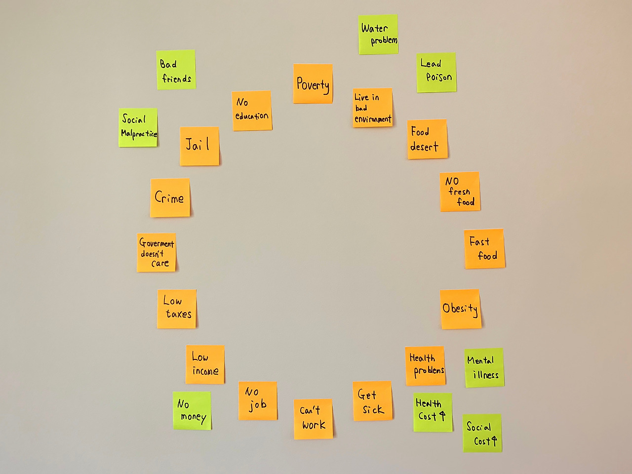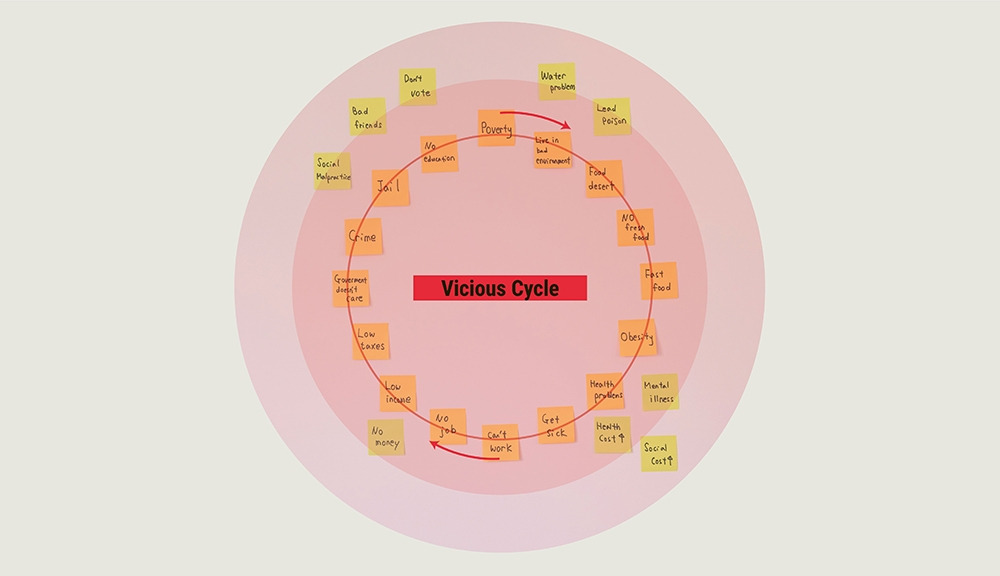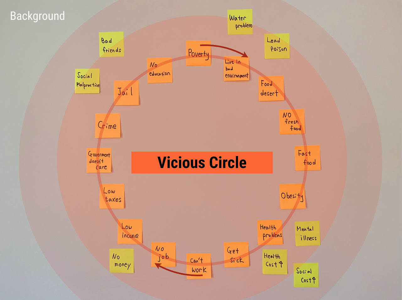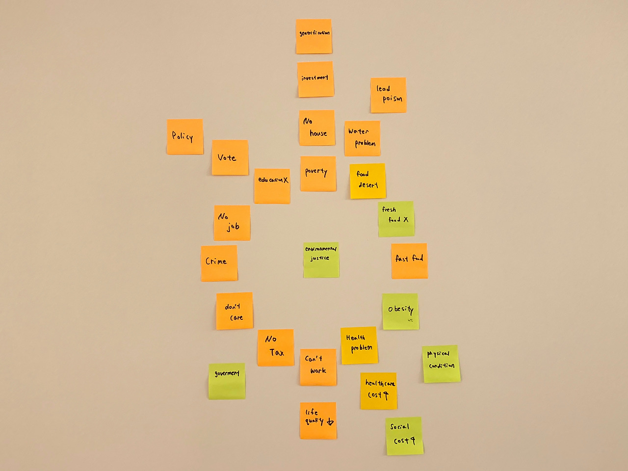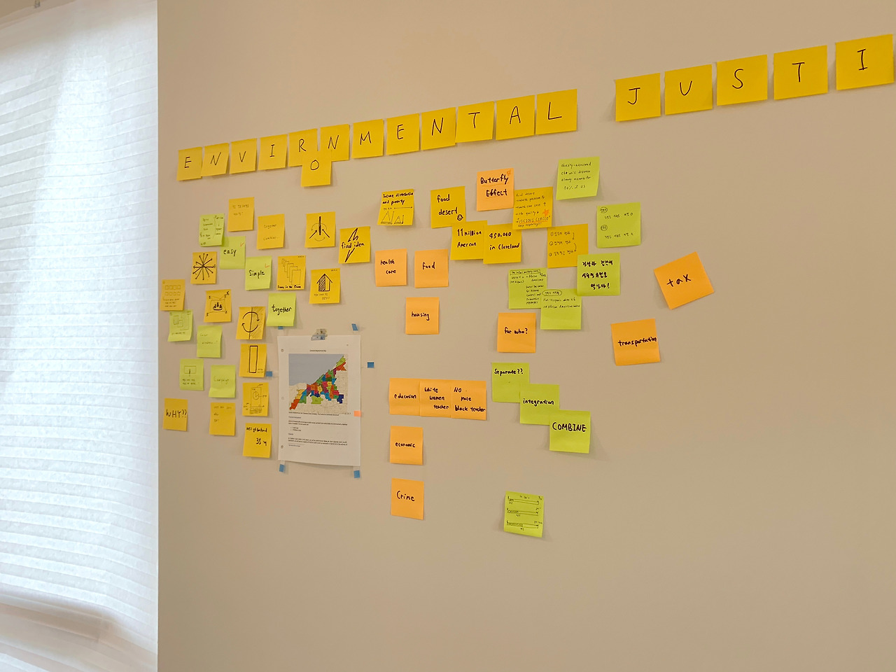 푸드 사막, 비만 등으로 인한 건강 문제, 물 오염 문제, 높은 범죄율, 총으로 인한 범죄, 오래된 집에 칠해져 있는 페인트로 인한 납중독 등 각종 문제점을 알게 될 때마다 포스트잇에 키워드를 써서 벽 한쪽에 붙이기 시작했다.