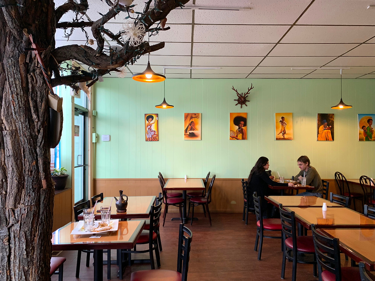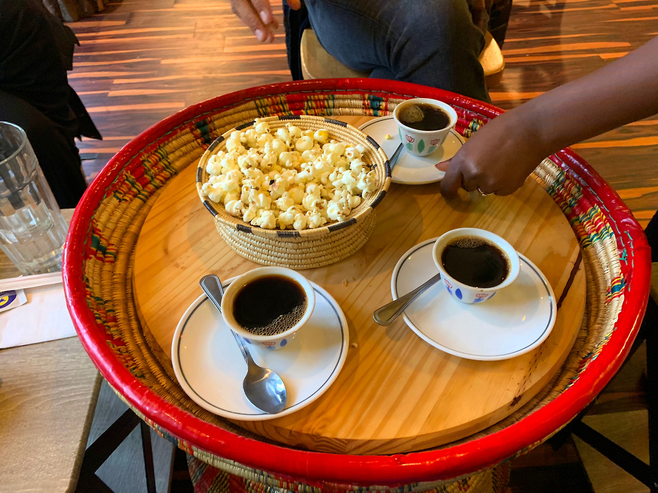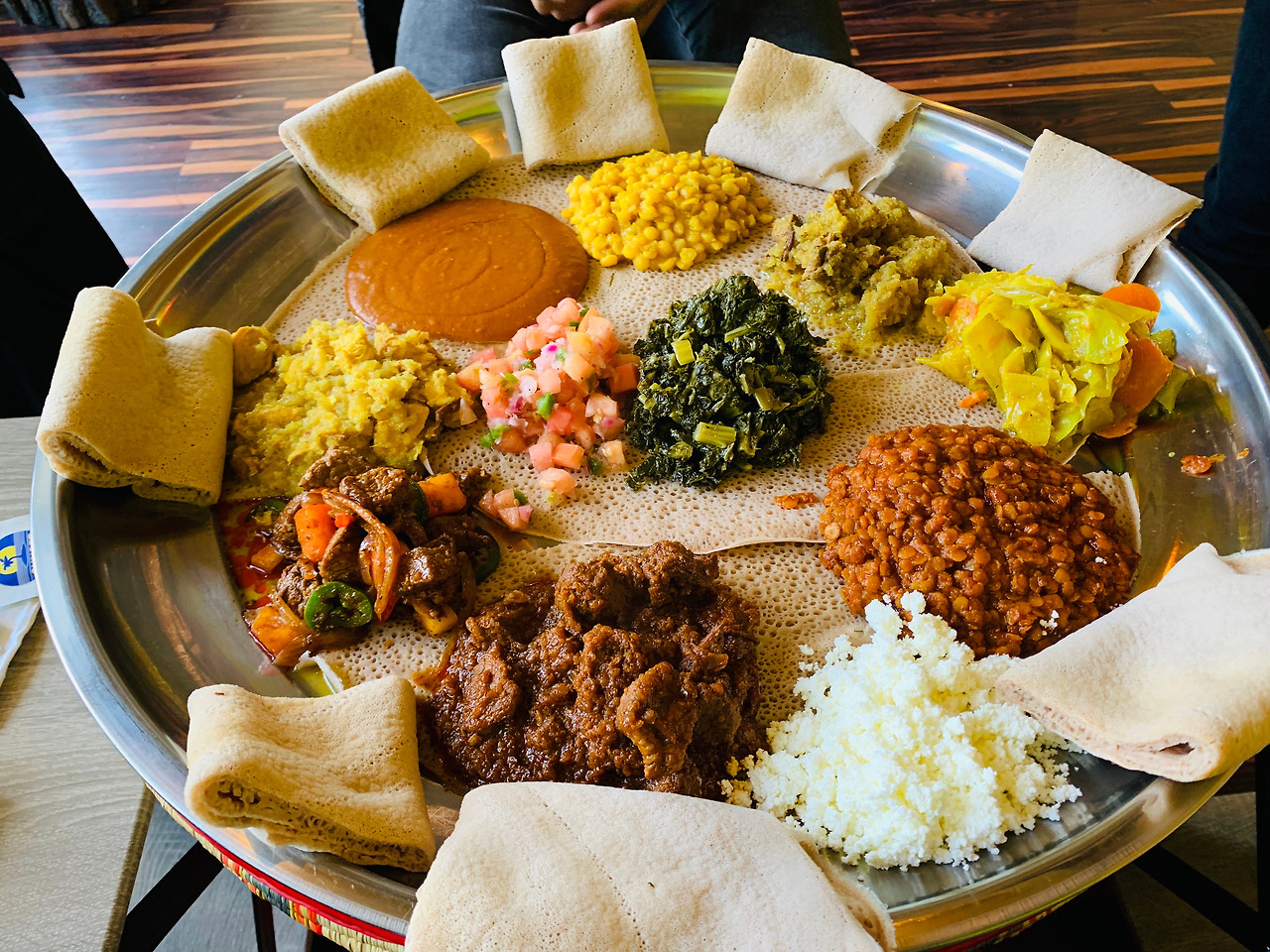 생애 첫 에티오피아 음식. 큰 쟁반에 여러 가지 음식이 담겨 나오는 음식들을 쟁반 주변에 있는 빵(?)에 싸 먹으면 되는데, 모든 음식을 손으로 먹는 상황이 처음엔 다소 어색했다. 하지만 음식은 정말 최고! 가운데 있는 음식은 나물 같아서 혼자서 다 먹어 버린 듯ㅎㅎ;;