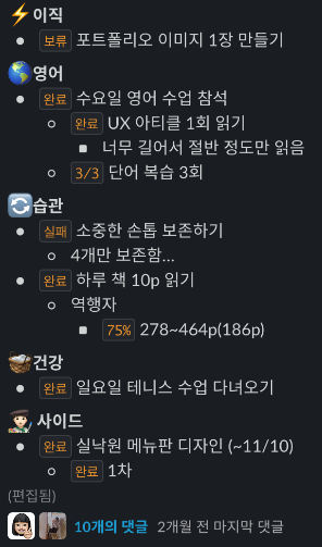9월에 다희랑 만나 이야기를 하다가 내가 주간 목표 공유를 슬랙으로 해보자고 추진했다. 그렇게 시작해서 현재까지 서로 주간, 일간 목표를 공유하고 응원한다. 서로의 행방..(?) 행보를 보고 약간의 감시 + 응원을 통해 친밀도가 높아지고 더 좋은 인연이 되었다.