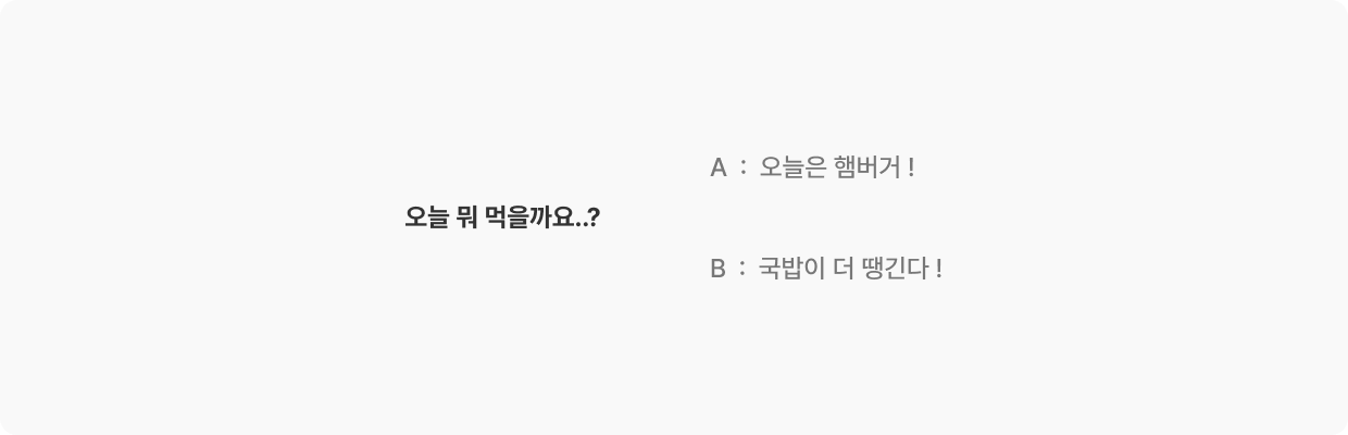 팀원들이 각자 메뉴를 먹은 뒤 만족도를 평가하고, 결과를 비교합니다. “역시 국밥이 든든해!”라는 피드백이 많다면 다음 날도 국밥을 선택할 가능성이 높아지고, 햄버거의 만족도가 더 높다면 새로운 선택지가 될 수 있죠.