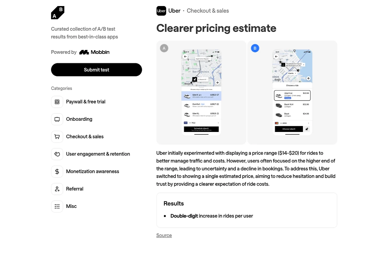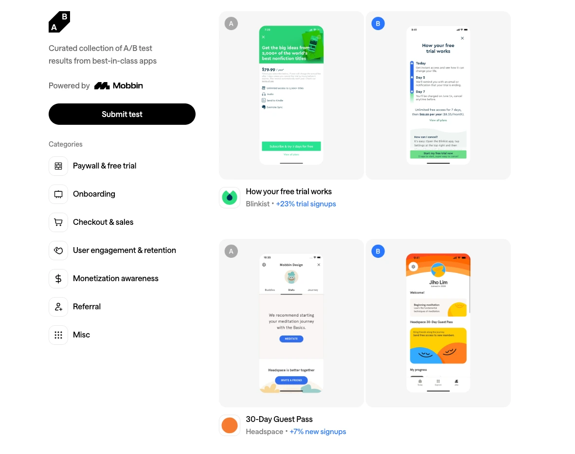 최고 수준의 앱에서 엄선된 A/B 테스트 결과 컬렉션이라고 소개되는 곳입니다.