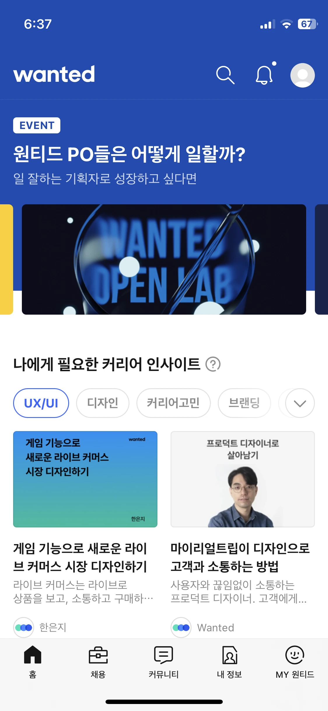 토스뿐만 아니라 원티드에서도 웹뷰를 활용한 사례가 있습니다. 눈에 띄는 점은 웹뷰지만 앱처럼 느껴지게 하려고 앱의 간결한 디자인을 웹뷰에 적용한 부분이에요.
