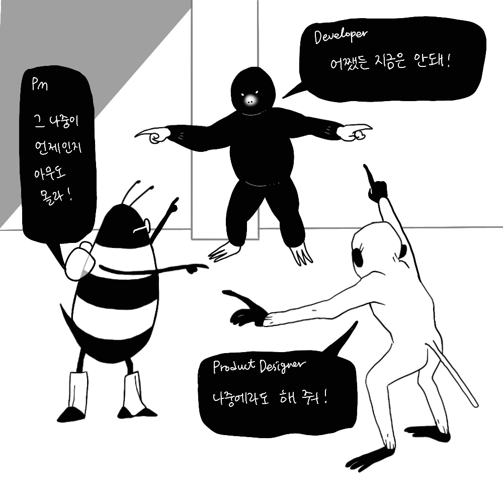 물론 개발자는 현실적인 구현을 책임지기 때문에 종종 '지금은 안 돼요'라고 말할 수도 있지만, 프로덕트 디자이너는 '지금은 안되지만 나중에는 꼭 이렇게 해줬으면 좋겠어요'라고 말할 책임과 힘이 있습니다. (하지만 개발자와의 소통은 늘 손에 땀을 쥐게 하죠 호호...^^;;)