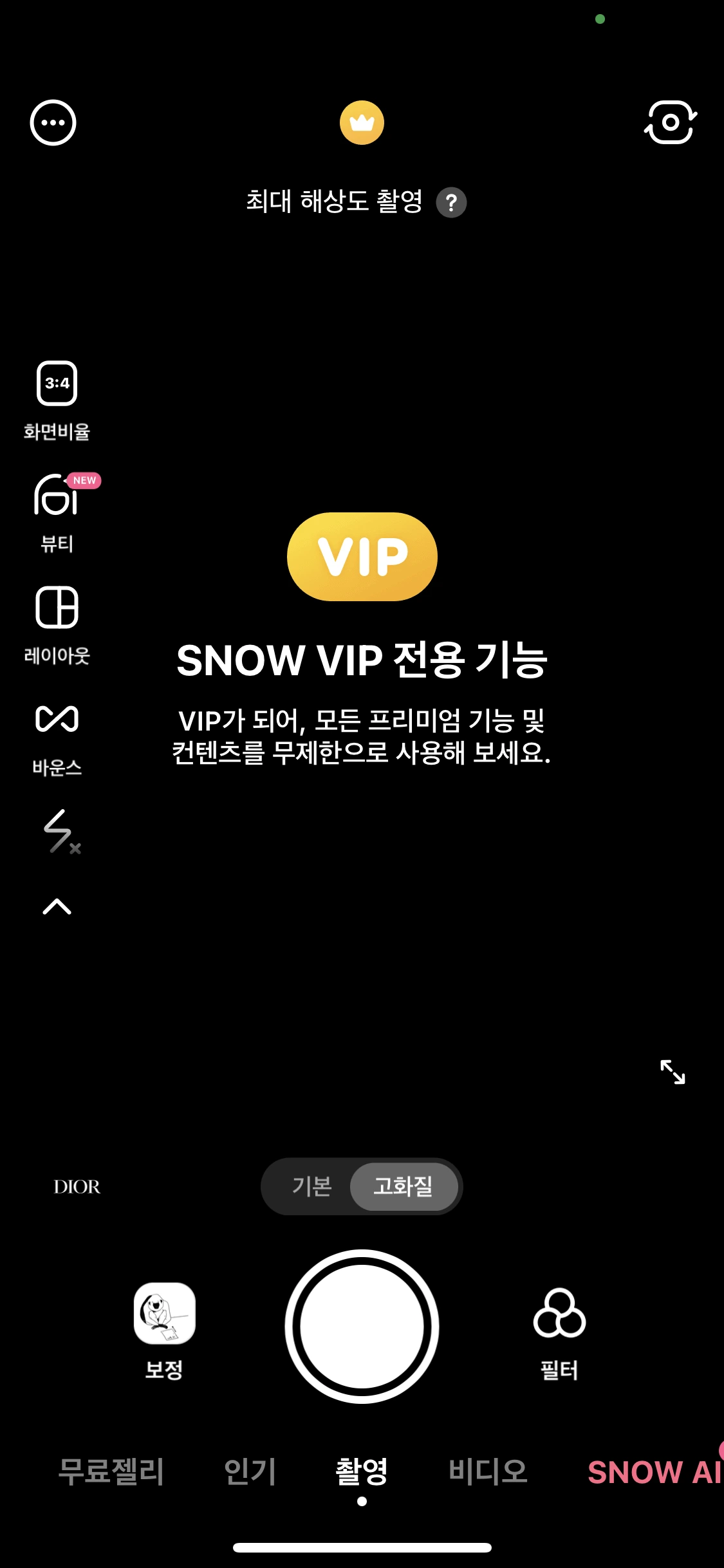 앱 내에서 캡처를 하면 캡처를 인식하고 ‘Snow VIP가 되어, 모든 혜택을 즐겨보세요!’라는 팝업이 뜨는데, 인기 탭에서 연 필터 카메라에서는 해당 다이얼로그가 뜨지 않았어요. 네이티브에서는 캡처라는 유저 액션을 추적하기 수월하지만 웹뷰에서는 그렇지 않기 때문일 거예요.