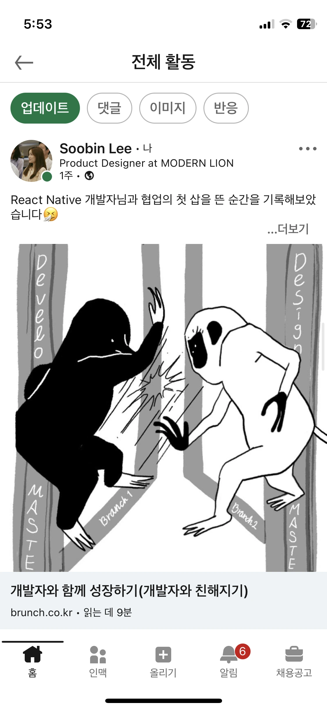네, 여전히 링크드인에 계신 게 맞아요. 하지만 아티클을 보여주는 그 페이지는 정확히 말하면 링크드인 앱 화면이 아니라 웹뷰입니다. 두 화면은 아예 다른 언어로 개발되었어요.